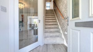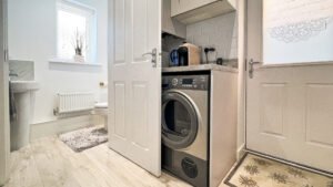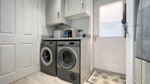 The kitchen is fitted with light grey units, granite effect worktops and spotlights at ground level creating a wonderful ambiance. A separate utility room is the perfect place for doing laundry as it is plumbed for a washing machine and tumble dryer. From here there is access to the side of the home. This is also where the ground floor W/C can be found.