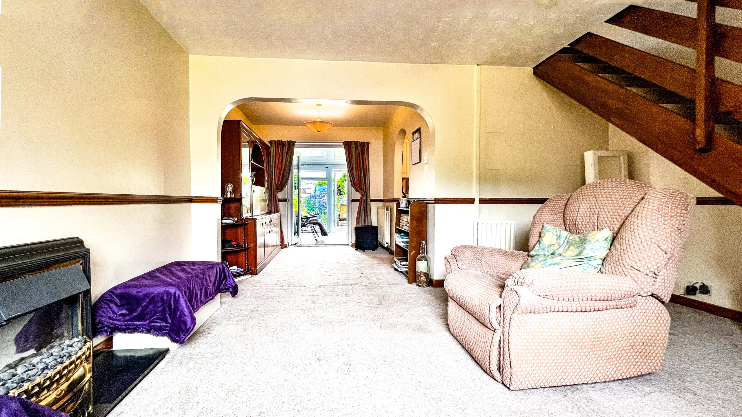 A gas fire is a focal point in the living room.