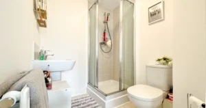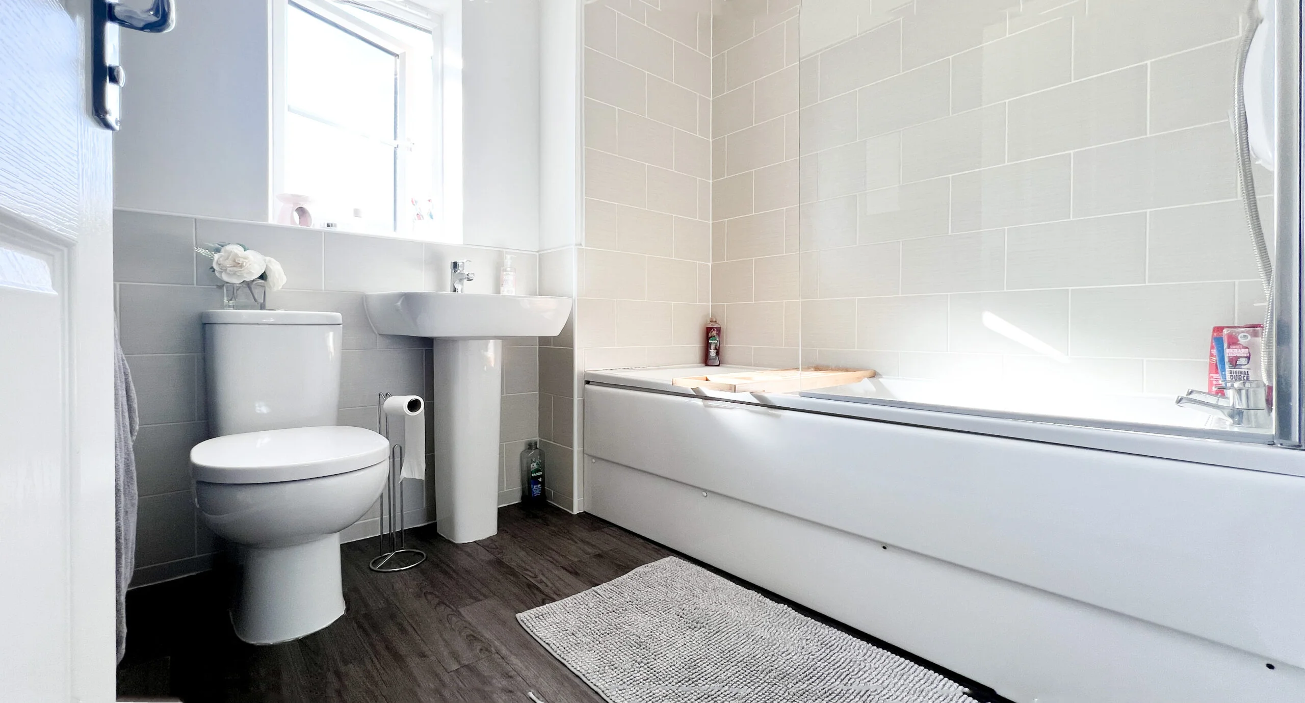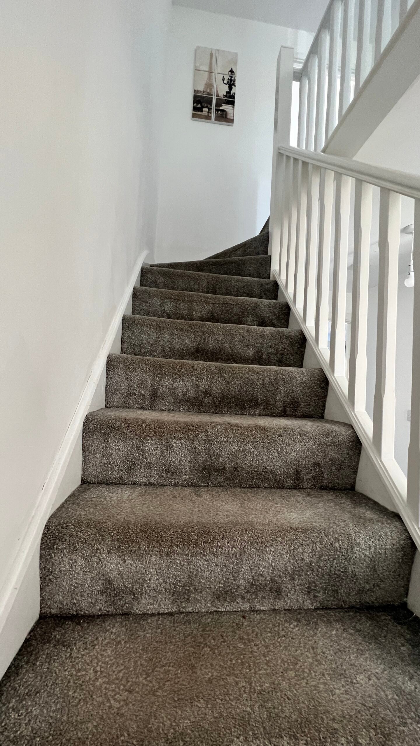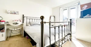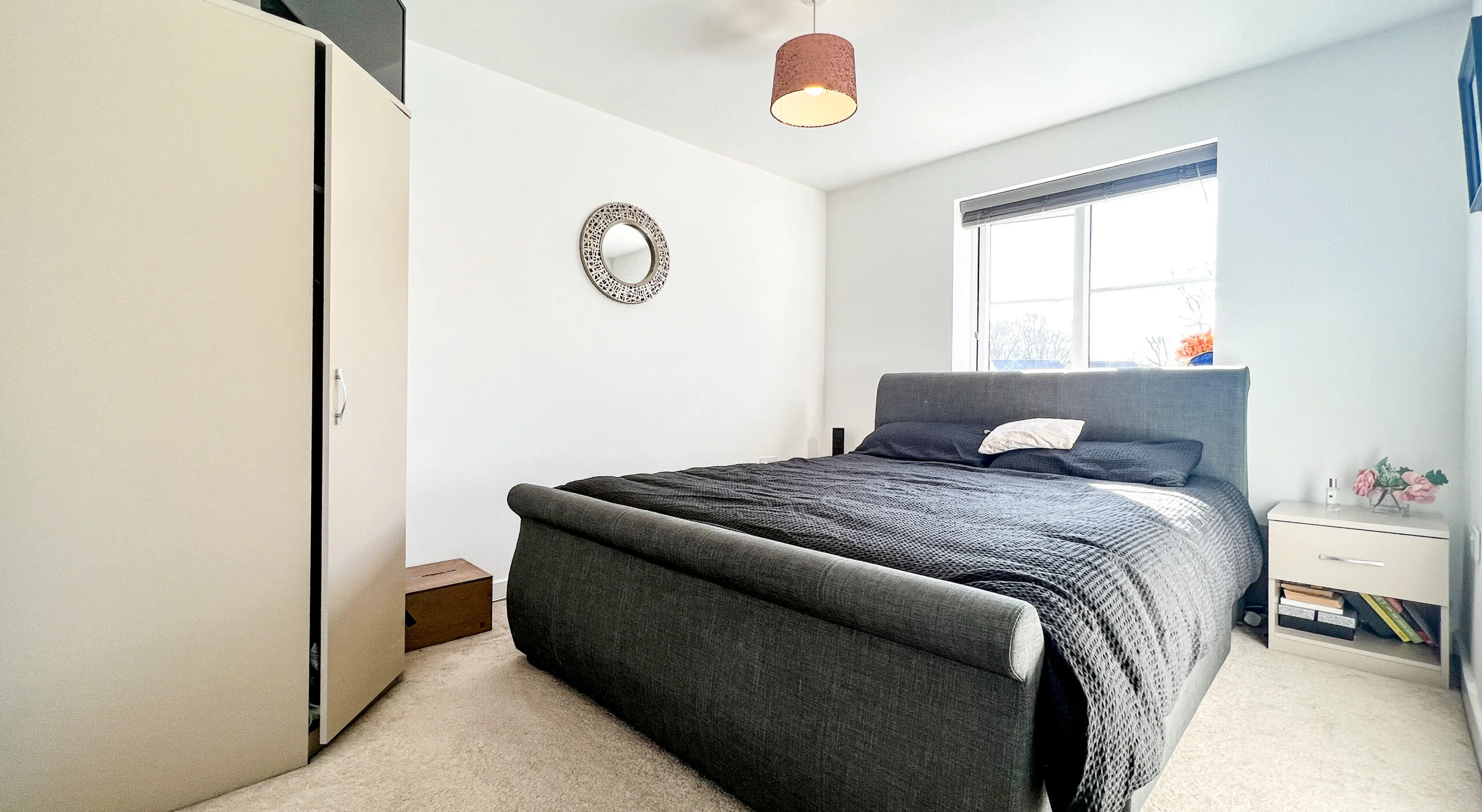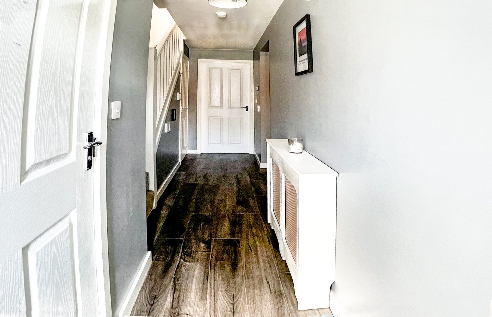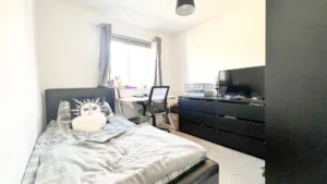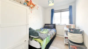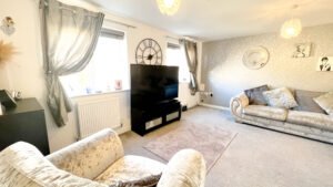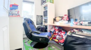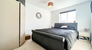 Up to the first floor, we have the living room. Decorated again in a stylish and modern silver grey paper, grey carpets and two windows for light and ventilation. The first double bedroom features French doors and a Juliette balcony giving this room such a lovely look and feel overlooking the front of the home. The small bedroom also sits at the front and is currently used as an office space/games room. This could be also used as a nursery if you have or are expecting a little one?