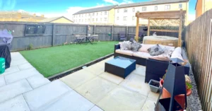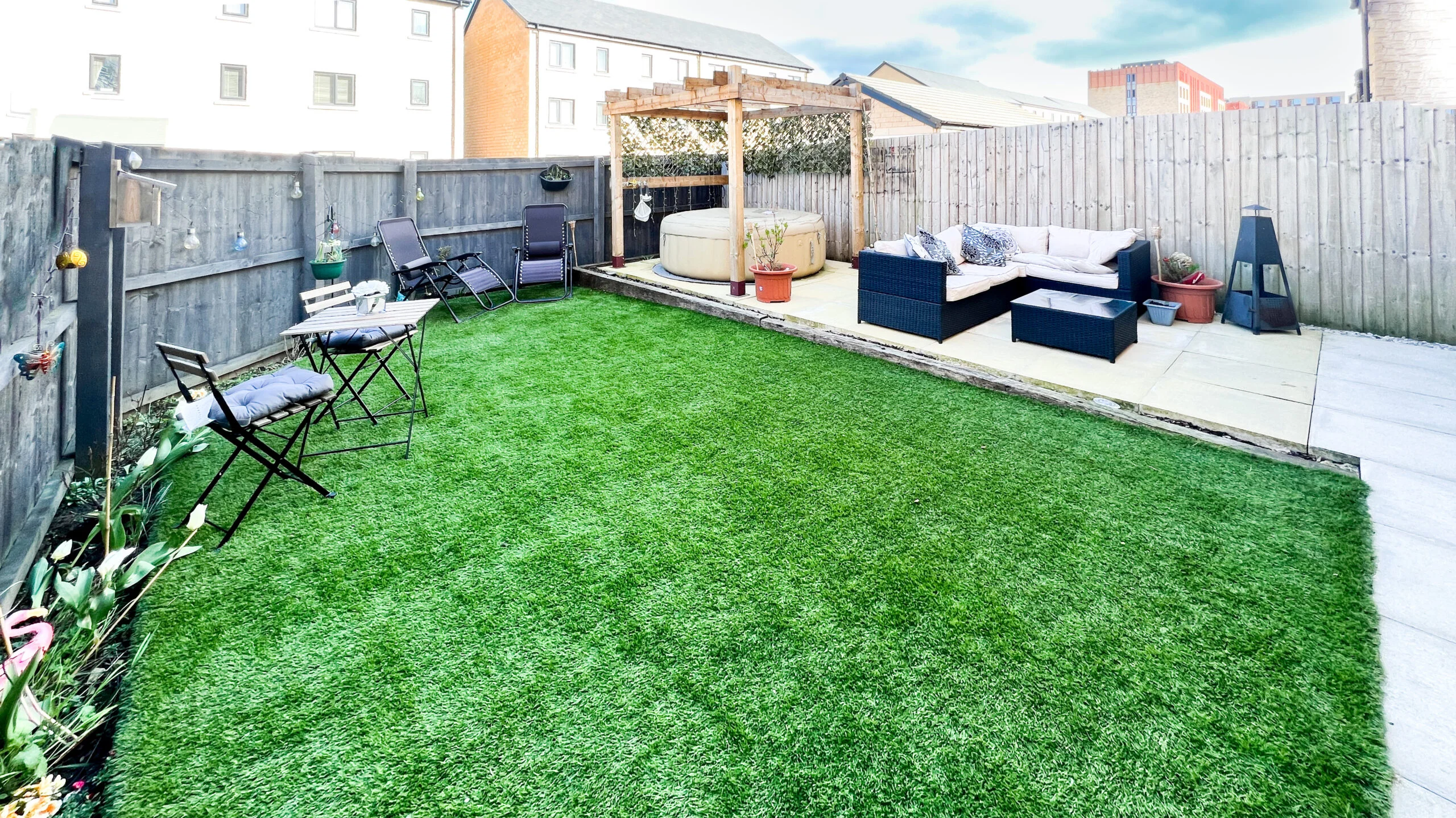 Access to the rear garden is through french doors. Artificial grass makes this garden very low maintenance yet stylish. A gate at the side of the home allows access through to the front of the home and for bins etc.