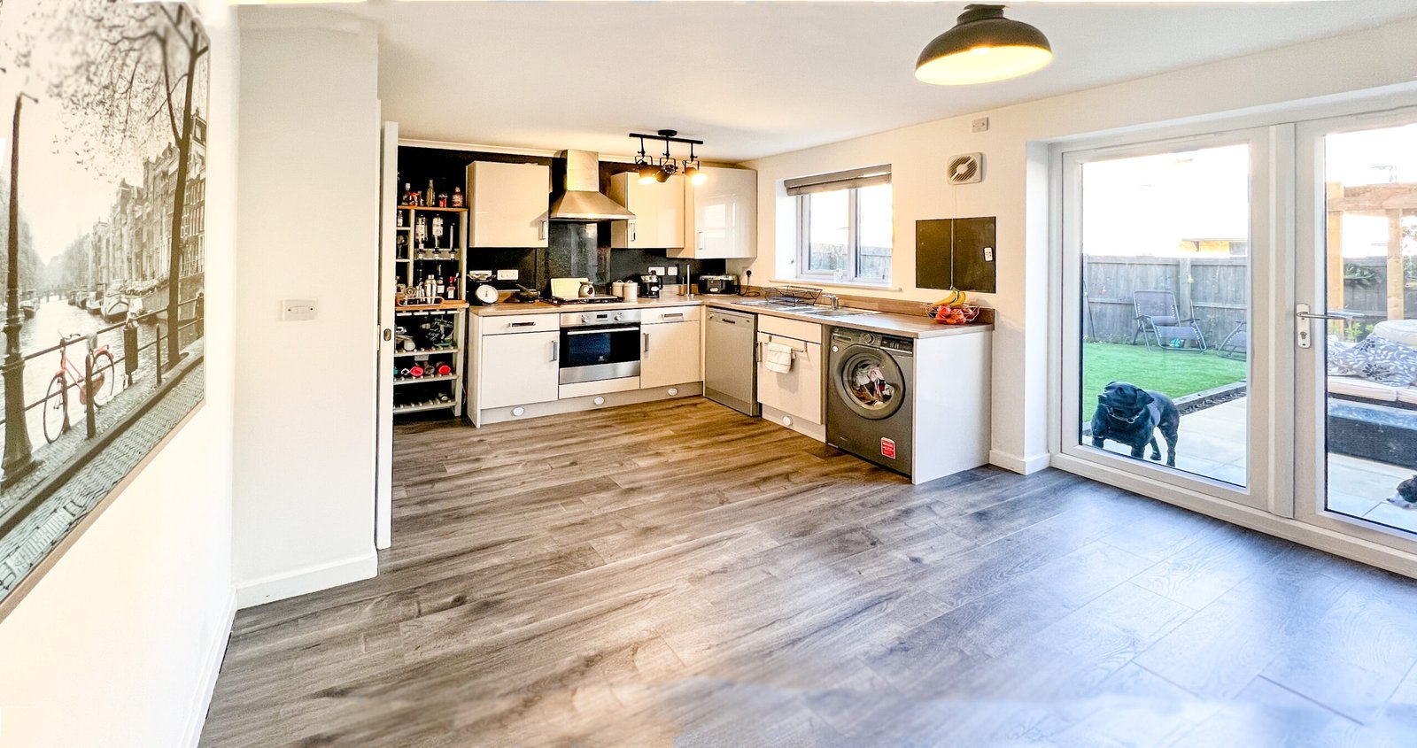 There is access to a garage a little further down the hallway which is plenty big enough to keep your car if you like to put it away overnight, or storage for bikes, tumble dryers etc...The kitchen is to the rear of the home and is a great space to host. There is plenty of room for a family dining table and chairs, plumbing for a dishwasher and washing machine. The hob is gas with an electric oven and stainless steel oven hood extractor. Black splashbacks give this kitchen a wonderful monochrome look that really compliments the units.